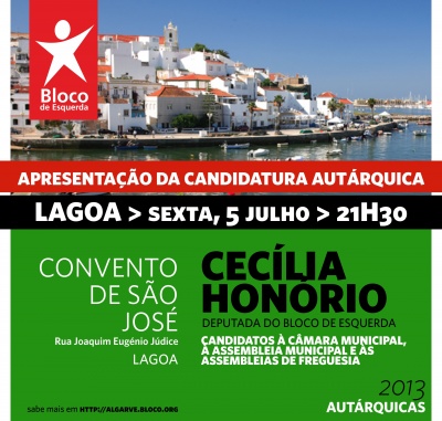 Com o slogan “LAGOA DINÂMICA E SOLIDÁRIA”, o Bloco de Esquerda de Lagoa, no âmbito das eleições autárquicas de 2013, tem a honra de convidar toda a população a assistir à apresentação pública das candidaturas aos órgãos autárquicos do concelho de Lagoa.
