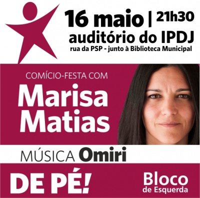 Esta iniciativa realiza-se em Faro, no Auditório do IPDJ (rua da PSP - junto à Biblioteca Municipal de Faro), pelas 21h30 e conta com a participação de Marisa Matias, João Semedo, Cecília Honório, Márcia Silva e João Vasconcelos. Além das intervenções políticas haverá lugar a música ao vivo com Omiri.