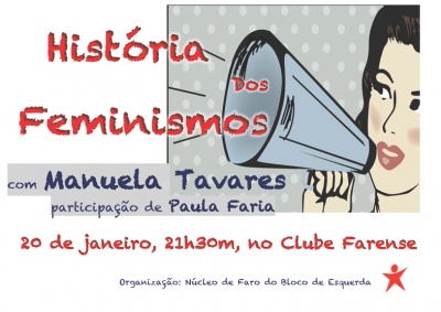 Realiza-se em Faro, no próximo dia 20 de janeiro, sexta-feira, uma sessão pública dedicada à "história dos feminismos em Portugal". Manuela Tavares, membro da UMAR - União de Mulheres Alternativa e Resposta -, é a oradora convidada desta sessão e irá trazer-nos uma visão dos movimentos feministas em Portugal deste o seu o seu aparecimento.