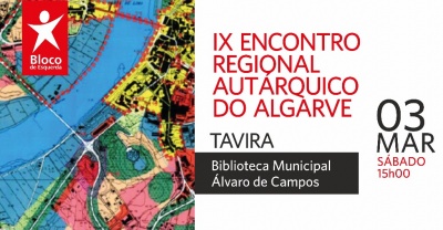 No dia 3 de março, o Bloco de Esquerda organiza o IX Encontro Regional Autárquico do Algarve. A sessão tem lugar em Tavira, na Biblioteca Municipal Álvaro de Campos, pelas 15 horas, e conta com a participação de Alberto Matos, Rui Costa - jurista e deputado na Assembleia Municipal de Lisboa - , e João Vasconcelos, deputado na Assembleia da República e vereador na Câmara Municipal de Portimão.