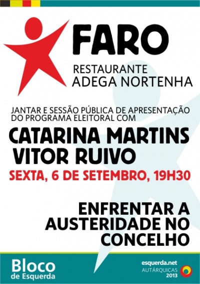 A candidatura autárquica do Bloco a Faro promove, na próxima sexta-feira, dia 6 de Setembro, um jantar convívio no restaurante a Adega Nortenha (Largo da Palmeira) com a presença da coordenadora do Bloco de Esquerda, Catarina Martins. Vítor Ruivo, candidato à Câmara Municipal de Faro apresentará o programa eleitoral autárquico do BE a este órgão.