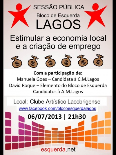 O BE de Lagos leva a efeito o 2.º debate público, com vista à construção partilhada das linhas de força do seu programa autárquico. Após o desafio de « Resgatar a democracia local», propomos debater, o « Estímulo da economia local e a criação de emprego» e, juntando forças, encontrarmos as propostas. É no próximo sábado, dia 6 de Julho às 21.30 no Clube Artístico Lacobrigense (mais conhecido como "Os Artistas") e a ação conta com a participação da candidata à Câmara Municipal de Lagos Manuela Goes, do elemento do BE David Roque e de candidatos à AM de Lagos por parte do BE. Contamos com a vossa presença e participação.