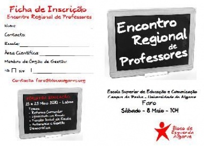 Convidamos-te a participar no Encontro Regional de Professores promovido pelo Bloco de Esquerda – Algarve que decorrerá no próximo sábado, dia 8 de Maio, na Escola Superior de Educação e Comunicação, em Faro.