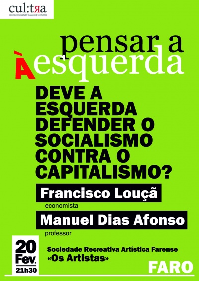 "Deve a esquerda defender o socialismo contra o capitalismo?" é o tema do debate com Francisco Louçã que a delegação do Algarve da Cultra promove já na próxima quinta-feira, dia 20, a partir das 21h30m, na sede da Sociedade Recreativa Artística Farense "Os Artistas", em Faro.