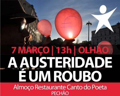 13h, Olhão - Pechão - almoço/convívio "A AUSTERIDADE É UM ROUBO" - restaurante Canto do Poeta. Mais informações e, ou inscrição: 962 997 680 e, ou secretariado.algarve@blocomail.org;