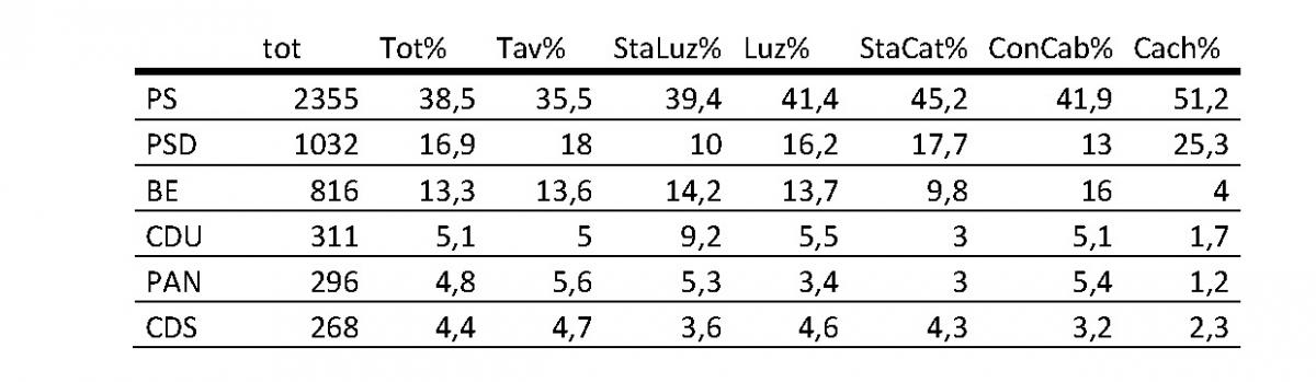 - nos 4 restantes concelhos o avanço em relação ao BE anda pelos 3 a 4%. Tav, Fao, Sil e Lga.