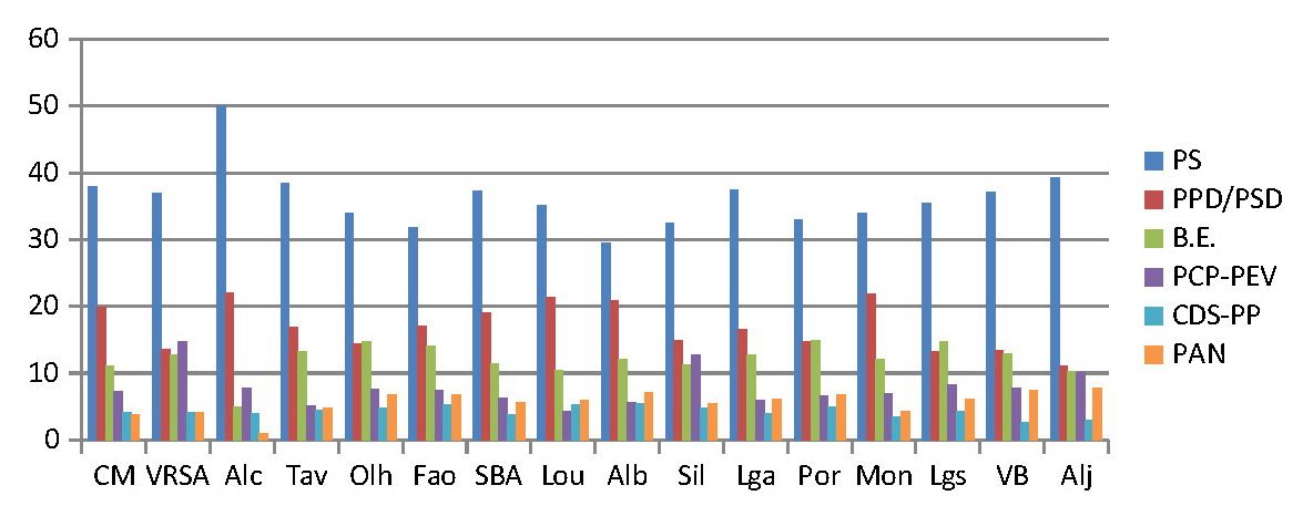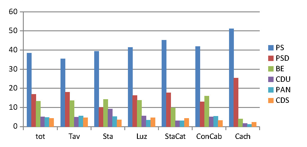 O PS ganha acima da média do distrito (38,5%), com votações sempre acima dos 35% em todas as freguesias.