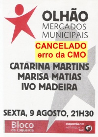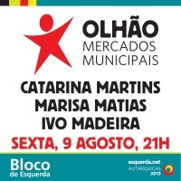 Realizar-se-á na próxima sexta-feira (9 de Agosto), pelas 21h30m, entre Mercados Municipais, na cidade de Olhão, uma sessão pública de Verão promovida pelo Bloco de Esquerda, que contará com a presença de Catarina Martins (deputada e dirigente do Bloco), Marisa Matias (eurodeputada do Bloco) e Ivo Madeira (cabeça de lista independente que integra as listas do Bloco para a Câmara Municipal de Olhão).