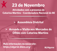 No dia 23 de Novembro, a coordenadora nacional do Bloco de Esquerda, Catarina Martins, irá estar presente num conjunto de atividades bloquistas. Na parte da manhã irá ocorrer uma arruada com visita aos Mercados de Olhão e durante a tarde haverá uma Assembleia Distrital de aderentes.