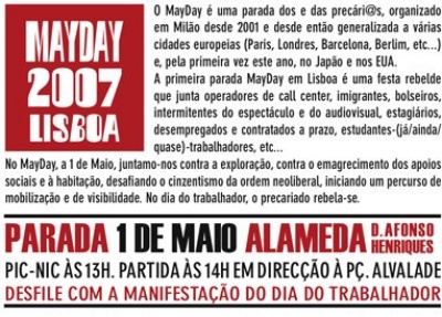 A parada MayDay passa este ano por Portugal. A Parada tem vindo nos últimos anos a mobilizar o protesto dos trabalhadores precários de cada vez mais países, num protesto cada vez mais global contra as dinâmicas capitalistas da precariedade laboral.
