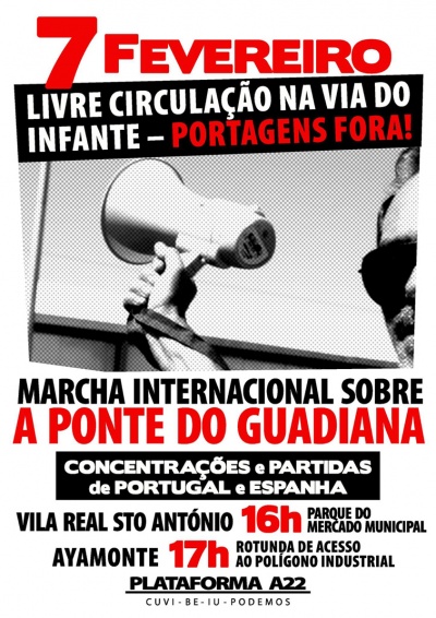 A ação chama-se “Marcha Internacional do Guadiana pela Livre Circulação na A22 – Portagens Fora!” e terá dois pontos de partida: de Vila Real de Santo António, parque do Mercado Municipal, pelas 16.00 h, e de Ayamonte, rotunda de acesso ao polígono industrial, pelas 17.00 h (hora espanhola). A marcha de viaturas irá circular sobre a ponte duas vezes seguidas.